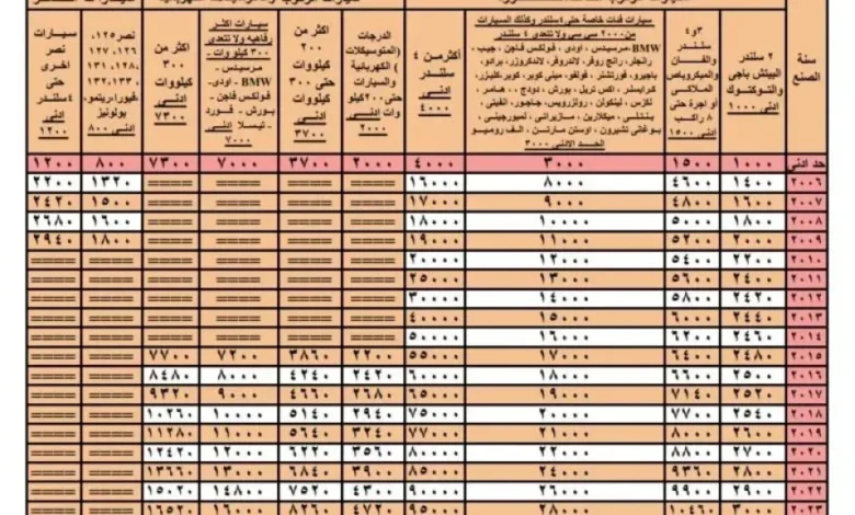 وتوضح الجداول تكلفة العقد المسجل للسيارات المستوردة والسيارات النصر والسيارات الكهربائية والدراجات النارية «الموتوسيكلات» لعام 2025.