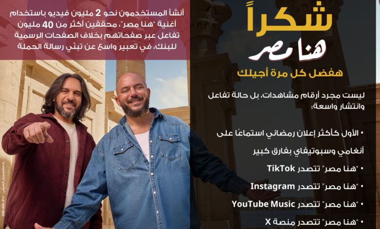 وبينما تعكس أرقام المشاهدات في كثير من الأحيان حجم الحملات الترويجية المدفوعة، فإن النجاح الحقيقي للحملات الإعلانية يظهر بشكل أوضح في حجم التفاعل والمشاركة الفعلية من الجمهور. وقد تجسد ذلك بوضوح في حملة بنك مصر “هنا مصر… هفضل كل مرة أجيلك”، حيث تحولت أغنية الحملة إلى حالة جماهيرية واسعة عبر مختلف المنصات.