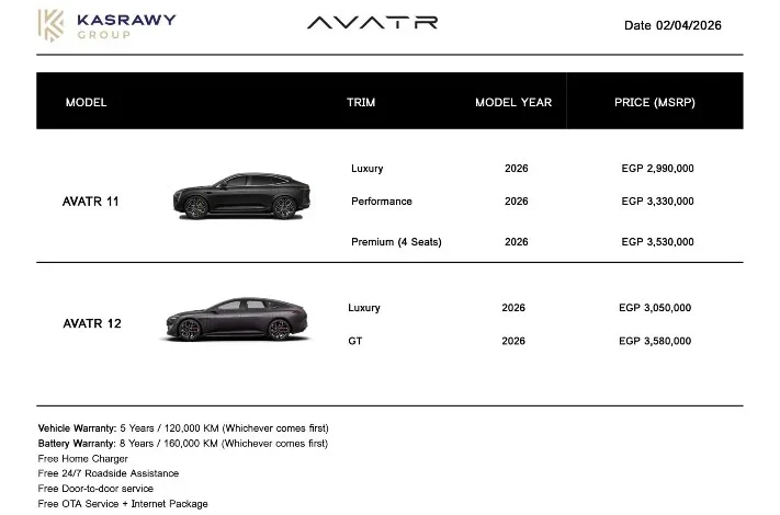 وشملت القائمة طراز AVATR 11 موديل 2026 بثلاث فئات، حيث سجلت الفئة Luxury نحو 2.99 مليون جنيه، فيما بلغت الفئة Performance حوالي 3.33 مليون جنيه، ووصلت الفئة الأعلى تجهيزًا Premium (أربعة مقاعد) إلى 3.53 مليون جنيه.